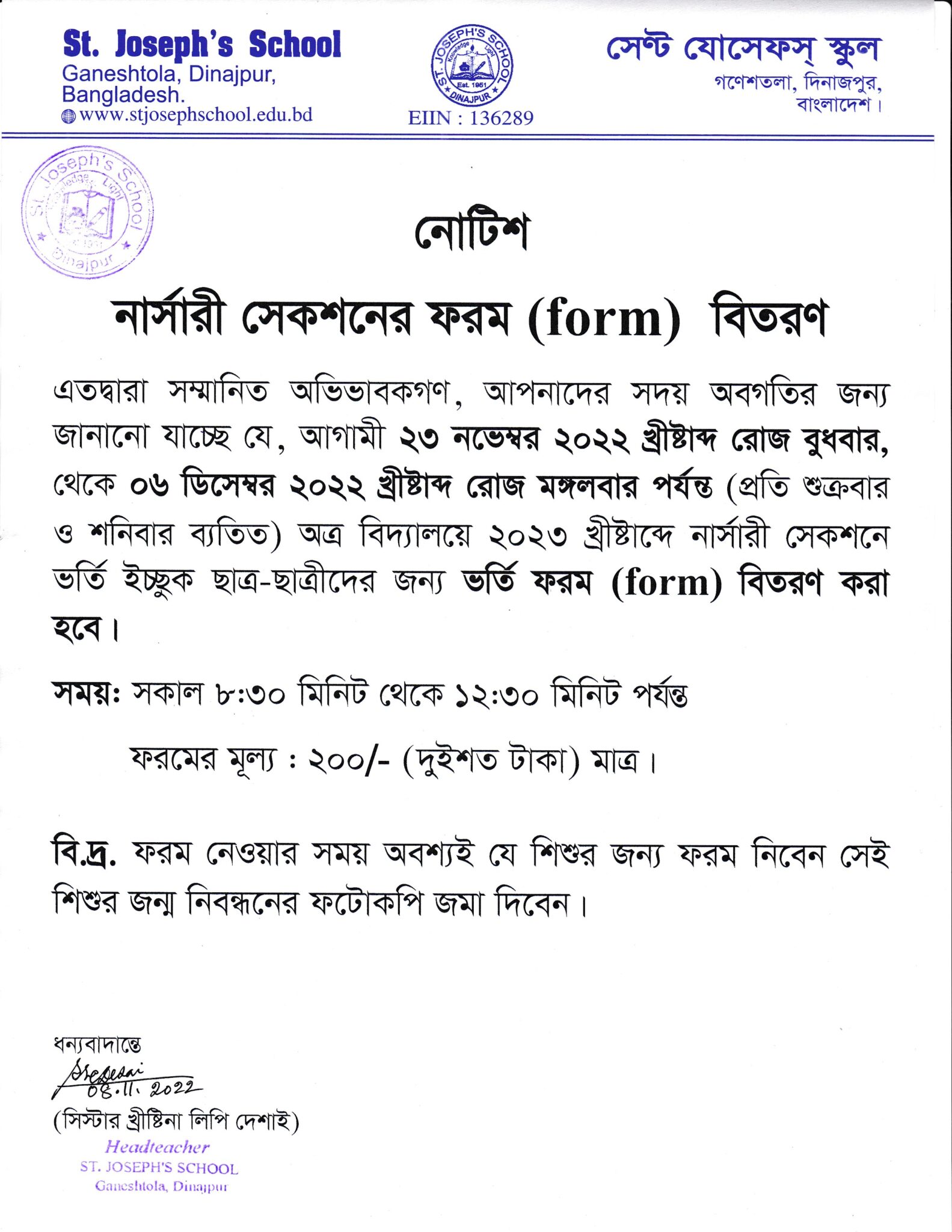 ২০২৩ খ্রীষ্টাব্দের নার্সারী সেকশনের ভর্তি ফরম বিতরণ ও জমা প্রসঙ্গে