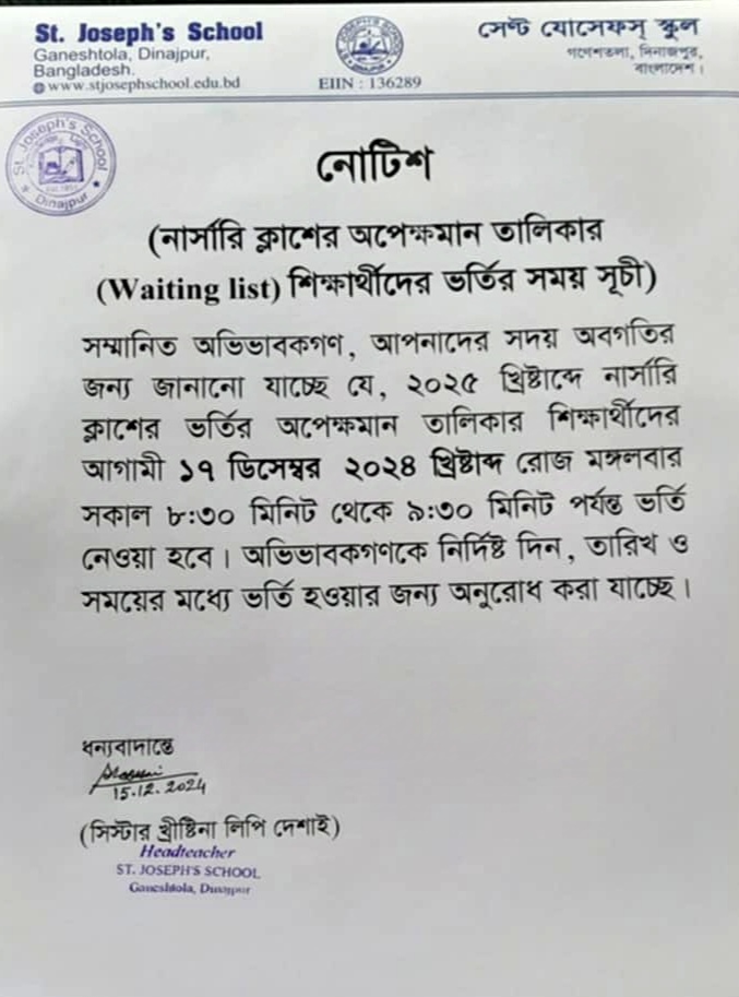২০২৫ শিক্ষাবর্ষে নার্সারি শ্রেণির অপেক্ষমান তালিকার শিক্ষার্থীদের ভর্তির সময়সূচী