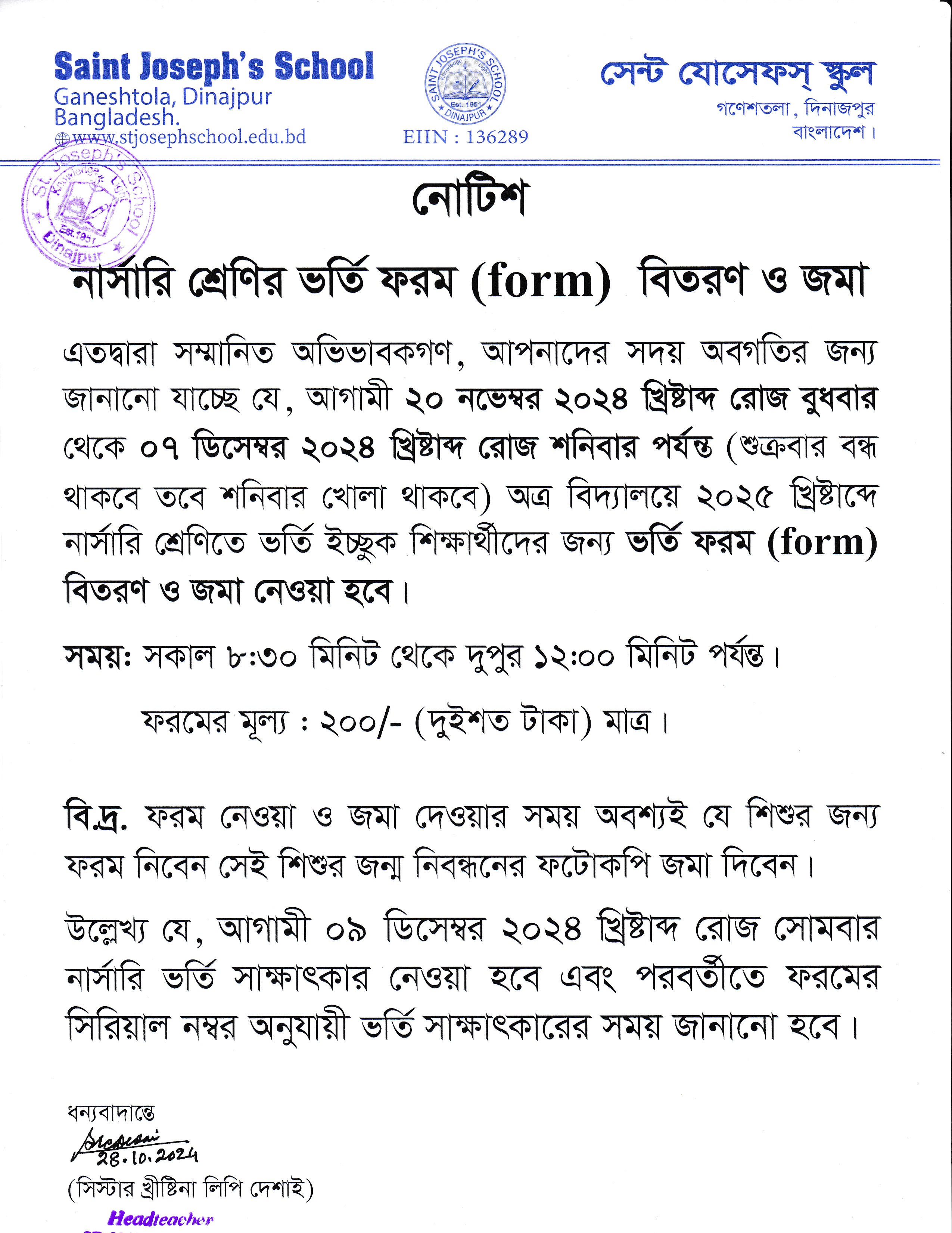 ২০২৫ শিক্ষাবর্ষে নার্সারি শ্রেণির ভর্তি ফরম বিতরণ ও জমা প্রসঙ্গে