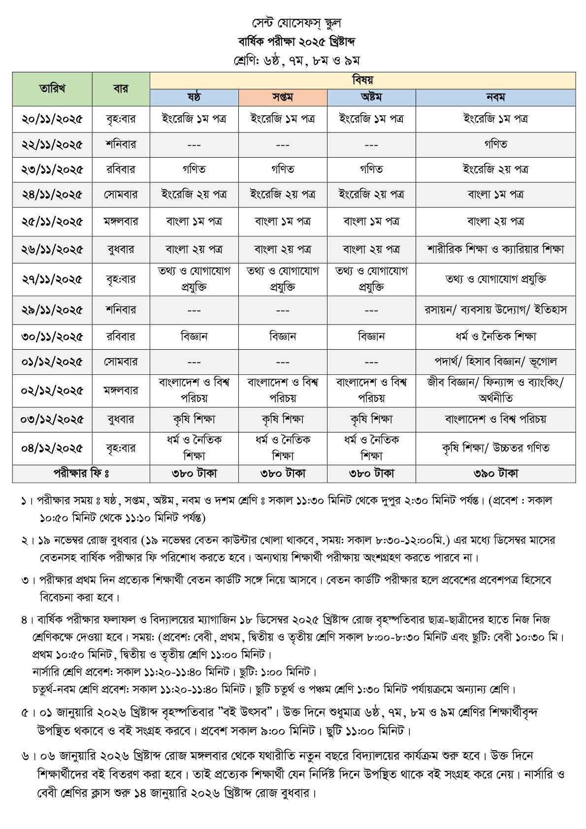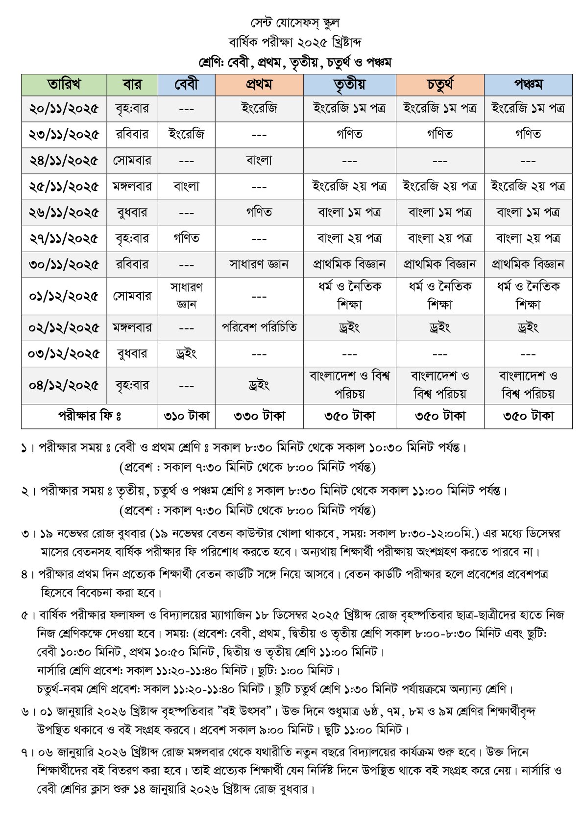 ২০২৫ খ্রীষ্টাব্দে বার্ষিক পরীক্ষার সময়সূচী