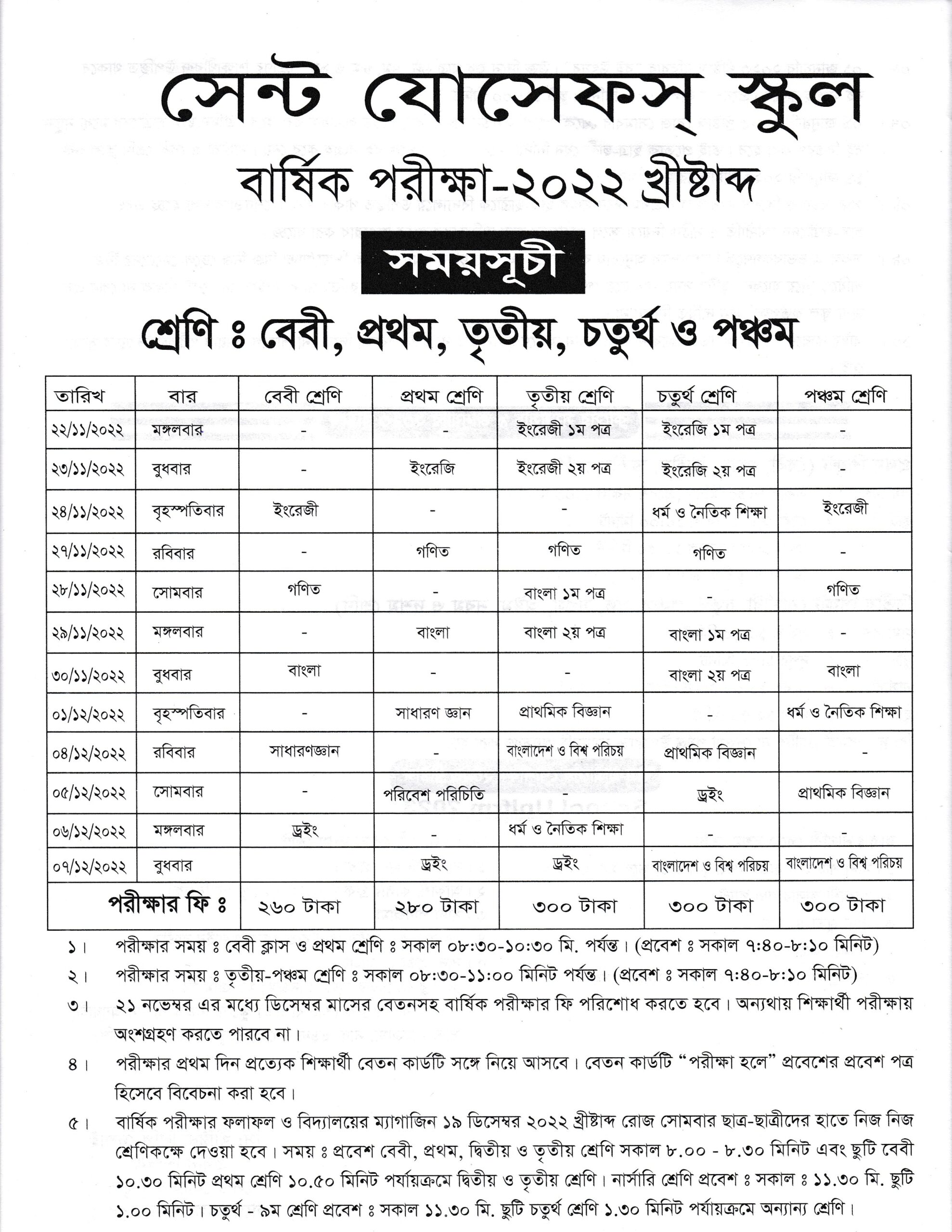 বার্ষিক পরীক্ষার রুটিন ও সময়সূচী – ২০২২ খ্রি: বেবী, ১ম, ৩য়, ৪র্থ ও ৫ম শ্রেণী