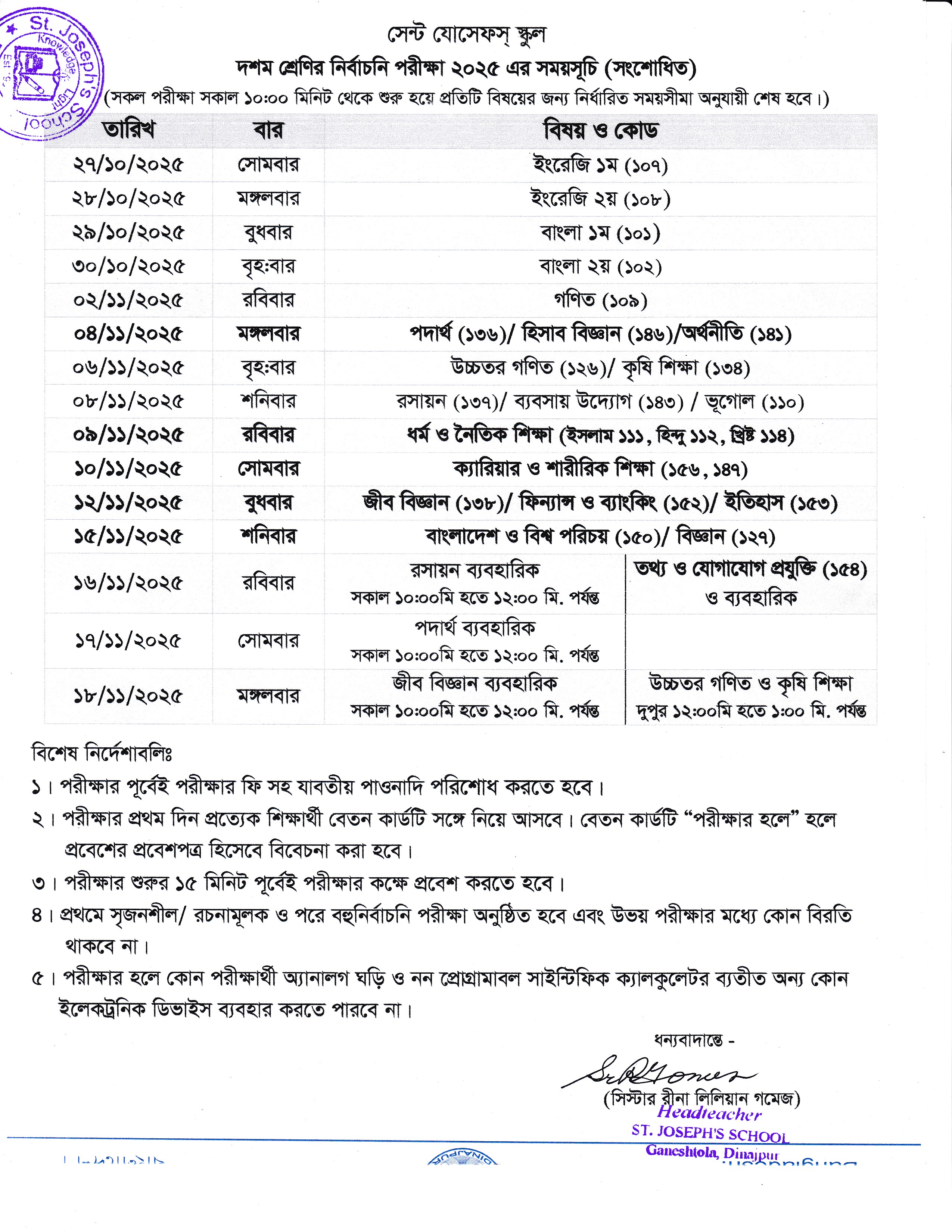দশম শ্রেণির নির্বাচনি পরীক্ষা ২০২৫ এর সময়সূচি