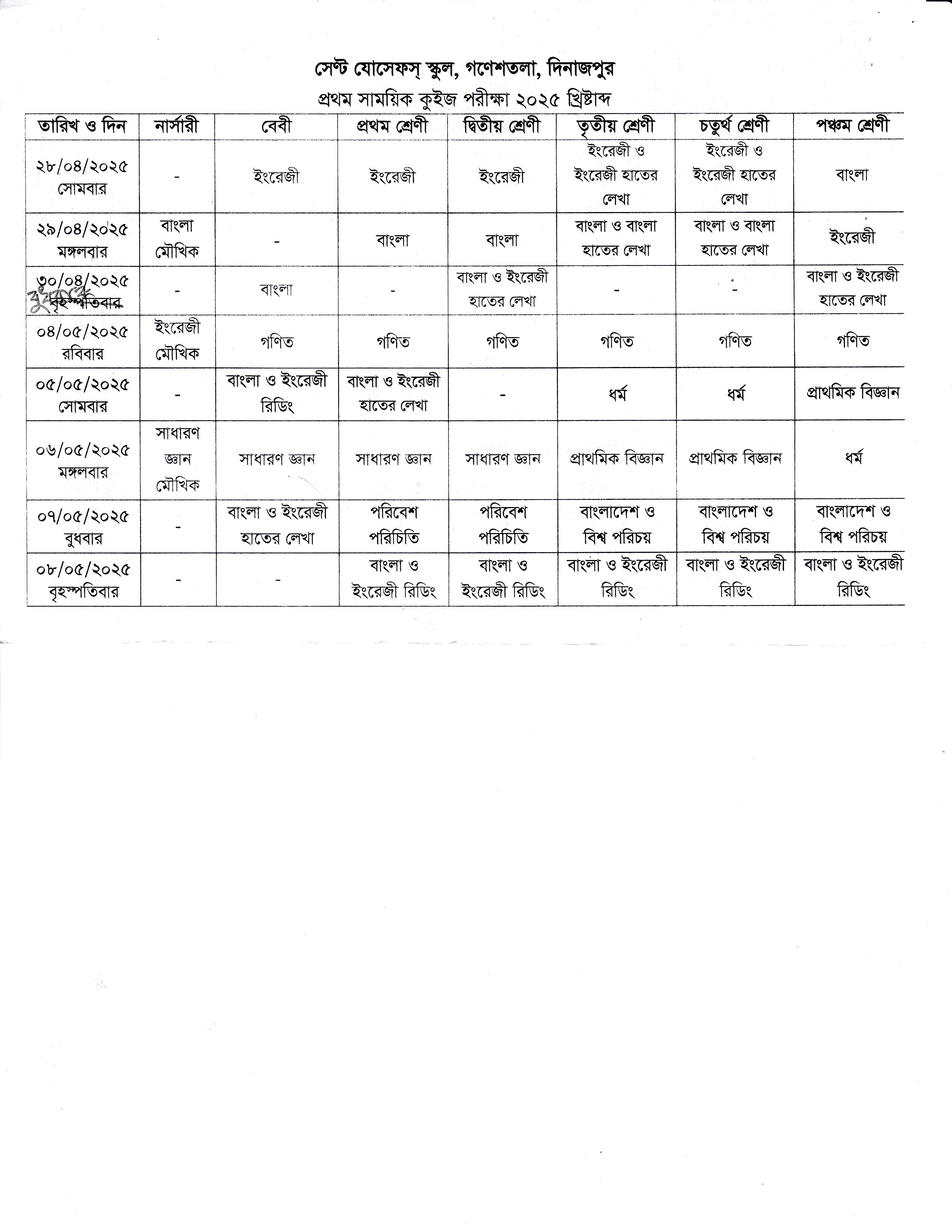 প্রথম সাময়িক কুইজ পরীক্ষা ২০২৫ খ্রি: