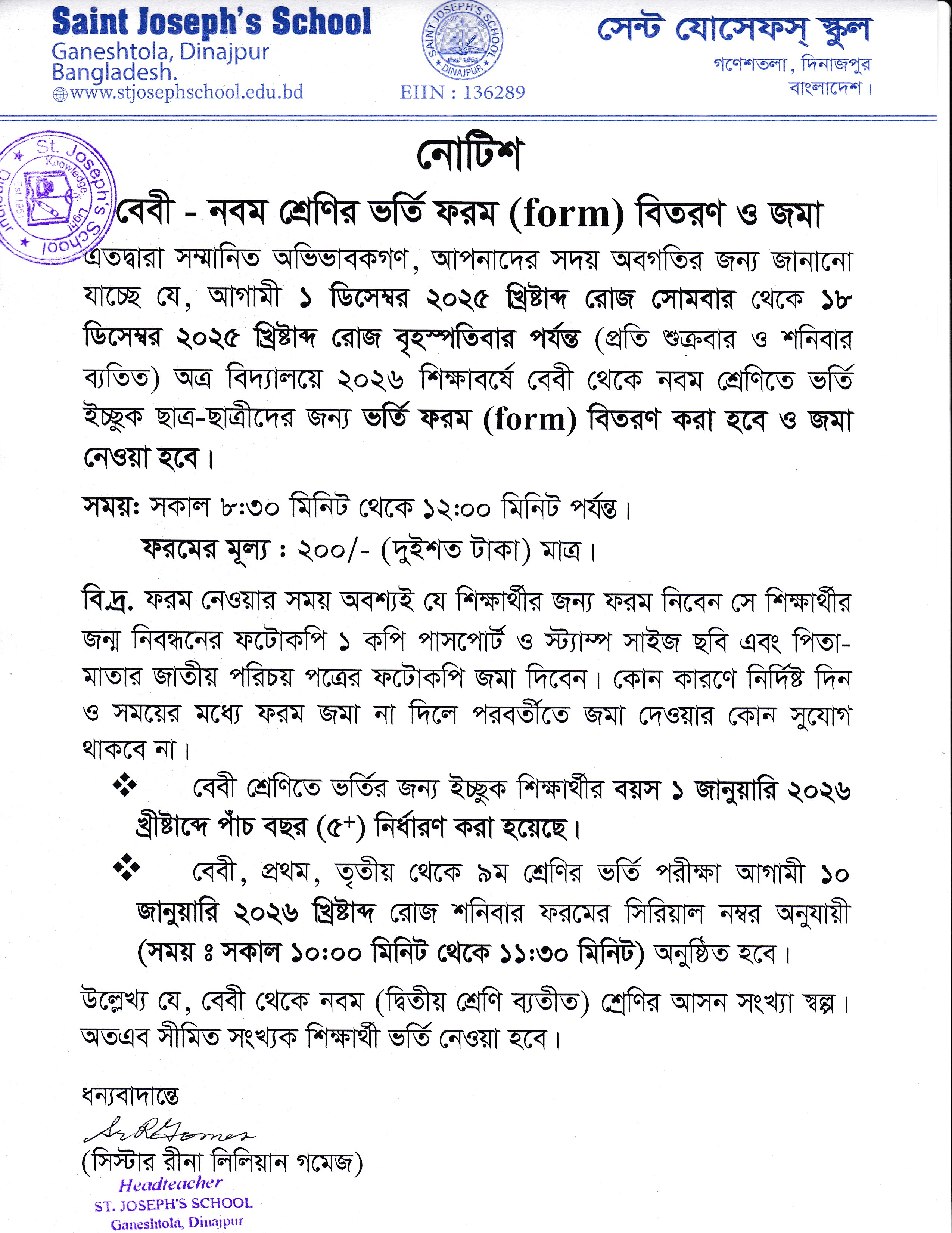 ২০২৬ শিক্ষাবর্ষে বেবী থেকে নবম শ্রেণির ভর্তি ফরম বিতরণ ও জমা প্রসঙ্গে