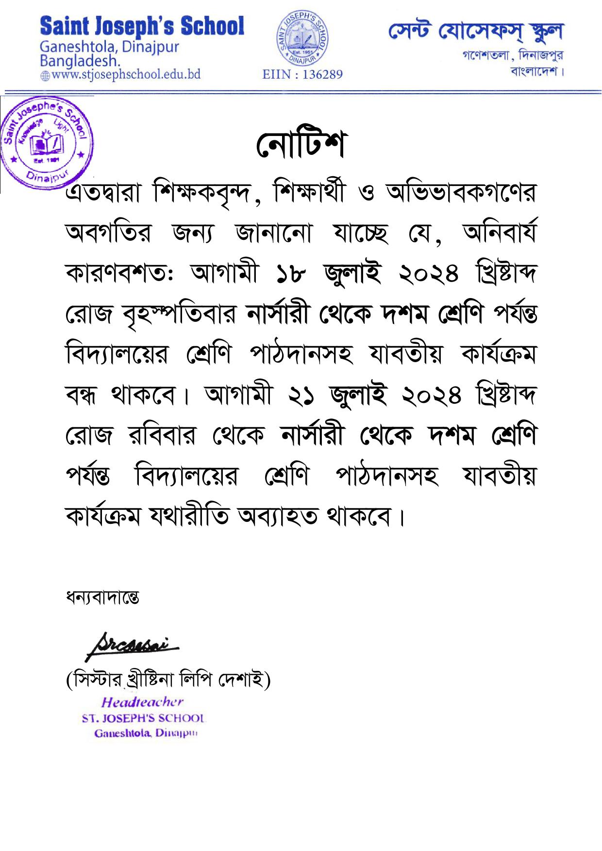 অনিবার্য কারণবশত: শ্রেণি পাঠদান সহ অন্যান্য কার্যক্রম বন্ধ প্রসঙ্গে