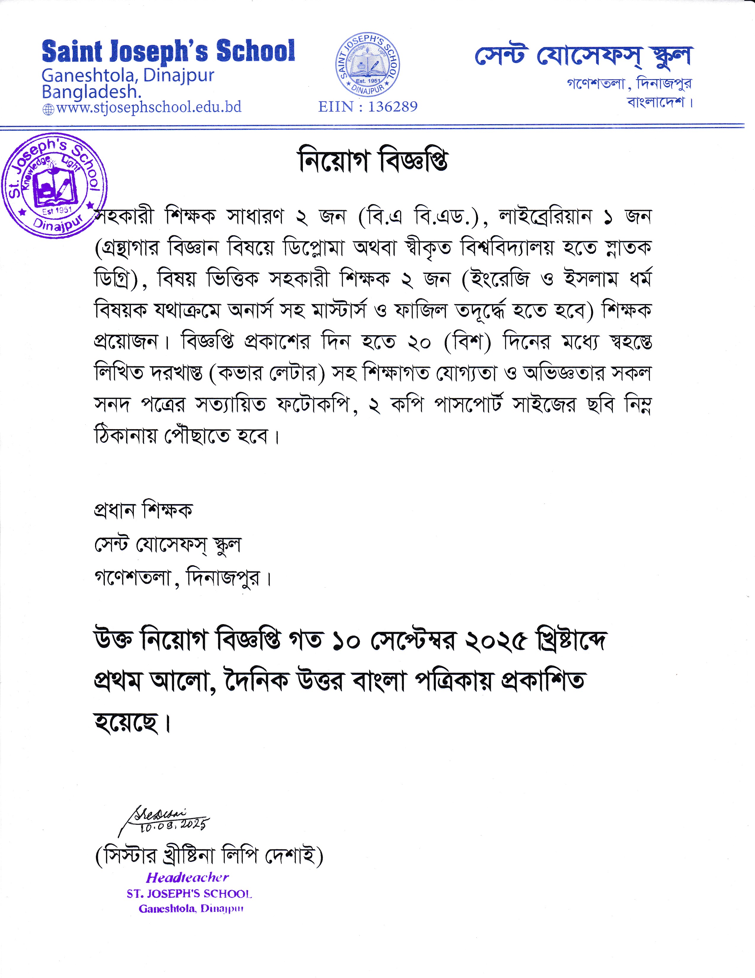 অত্র বিদ্যালয়ে বিভিন্ন পদে নিয়োগ বিজ্ঞপ্তি প্রসঙ্গে