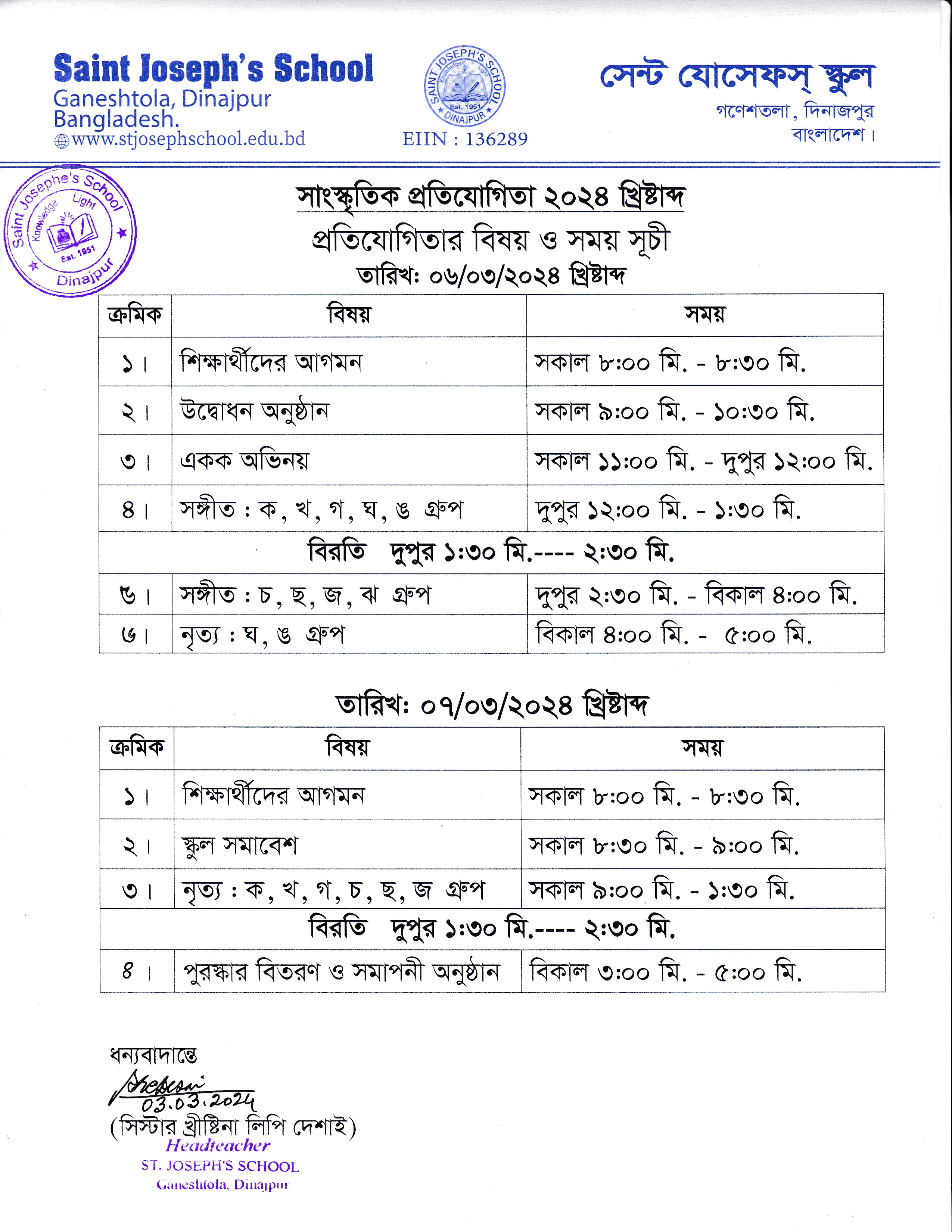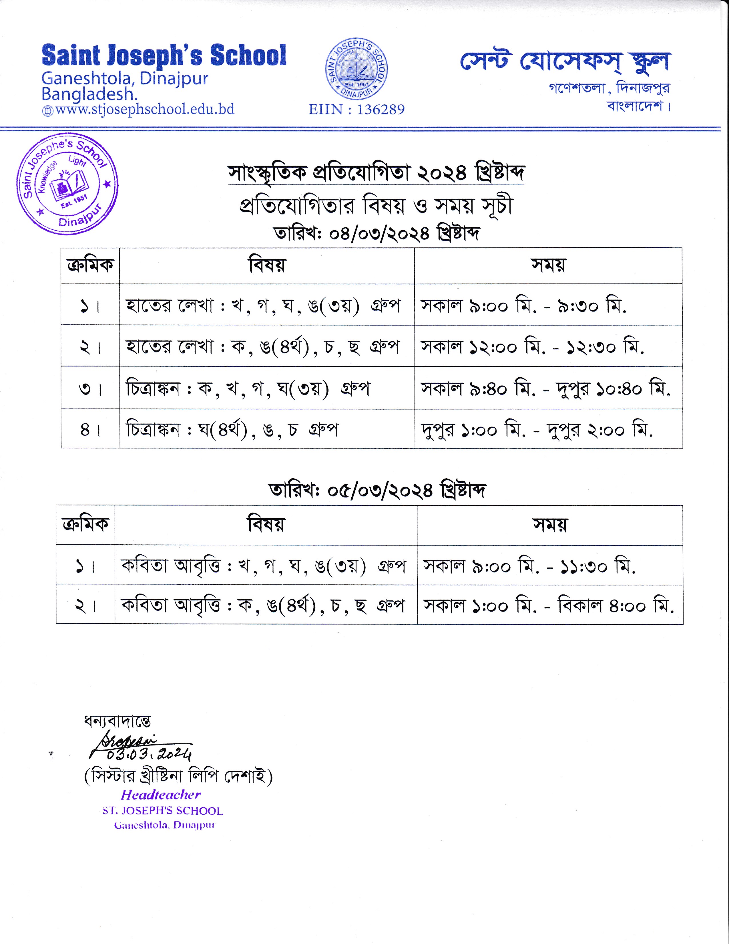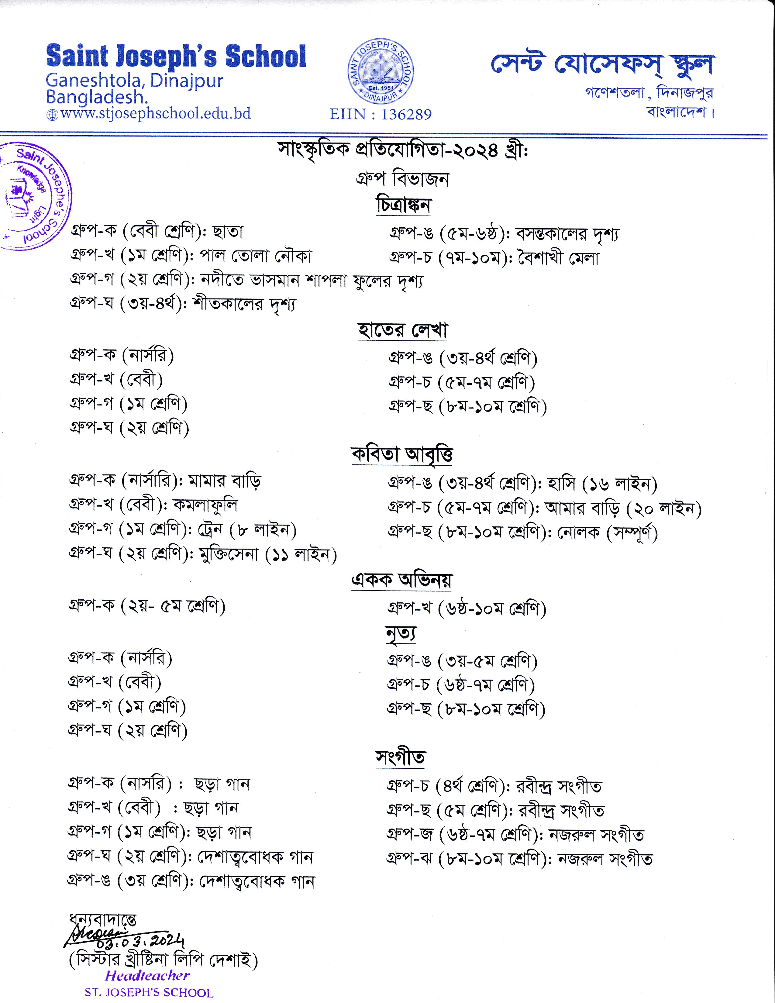 বার্ষিক সাংস্কৃতিক প্রতিযোগিতা ২০২৪ খ্রী: এর গ্রুপ বিভাজন, বিষয় ও সময় সূচী