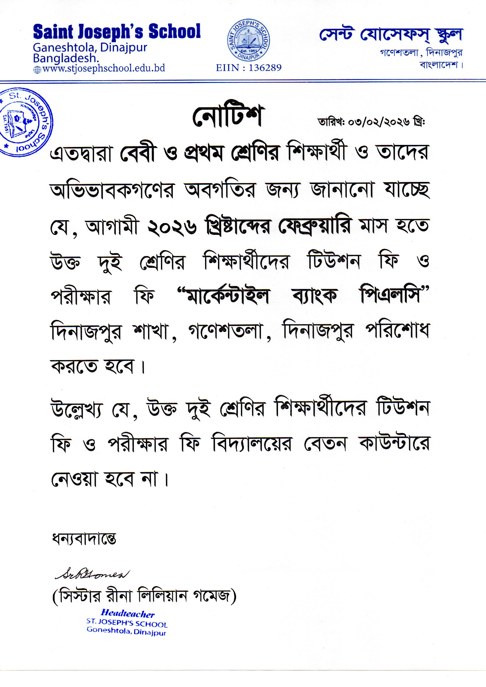 বেবী ও প্রথম শ্রেণির টিউশন ফি ও পরীক্ষা ফি মার্কেন্টাইল ব্যাংক পিএলসি শাখায় পরিশোধ প্রসঙ্গে