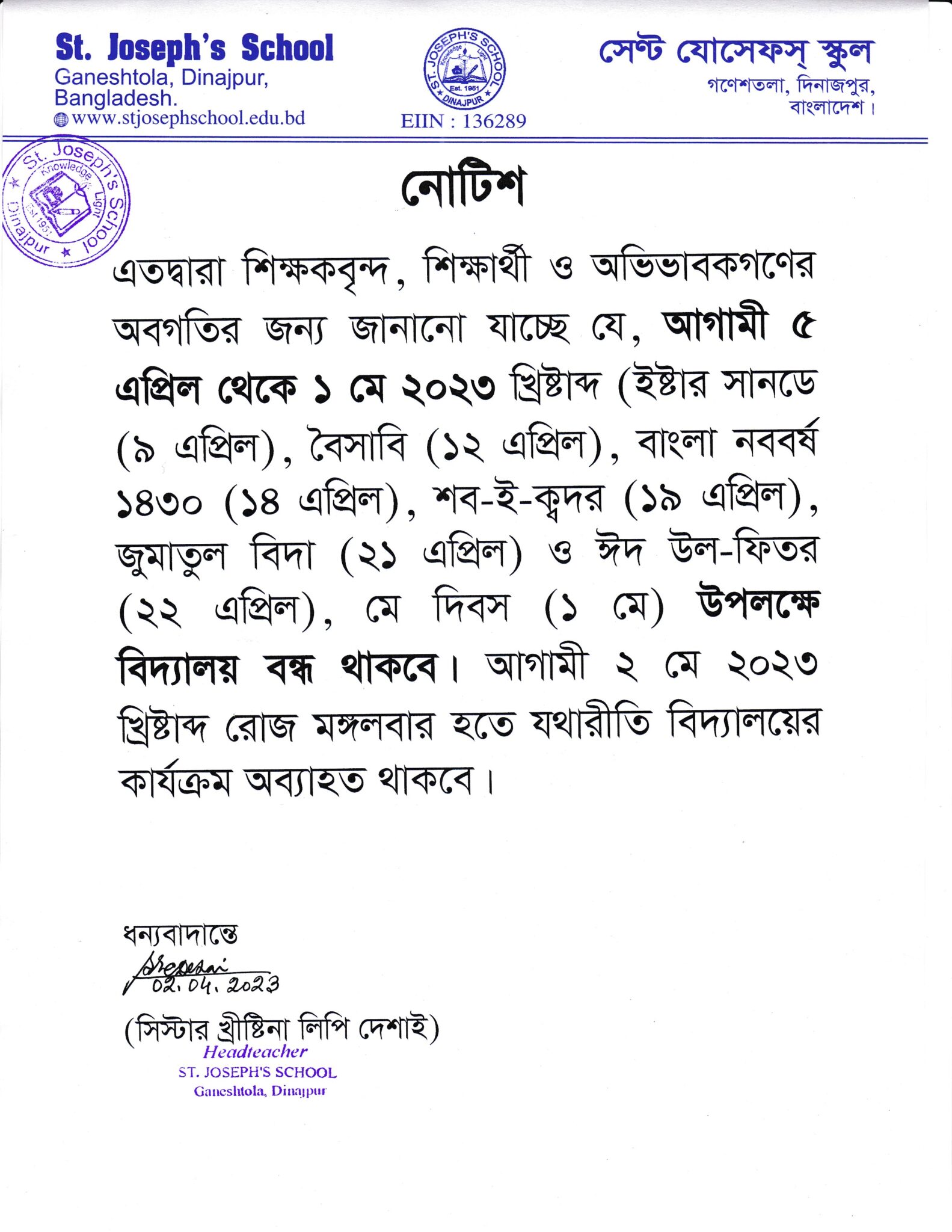 ইষ্টার সানডে, বৈসাবি, বাংলা নববর্ষ ও ঈদ উল-ফিতর ছুটি প্রসঙ্গে