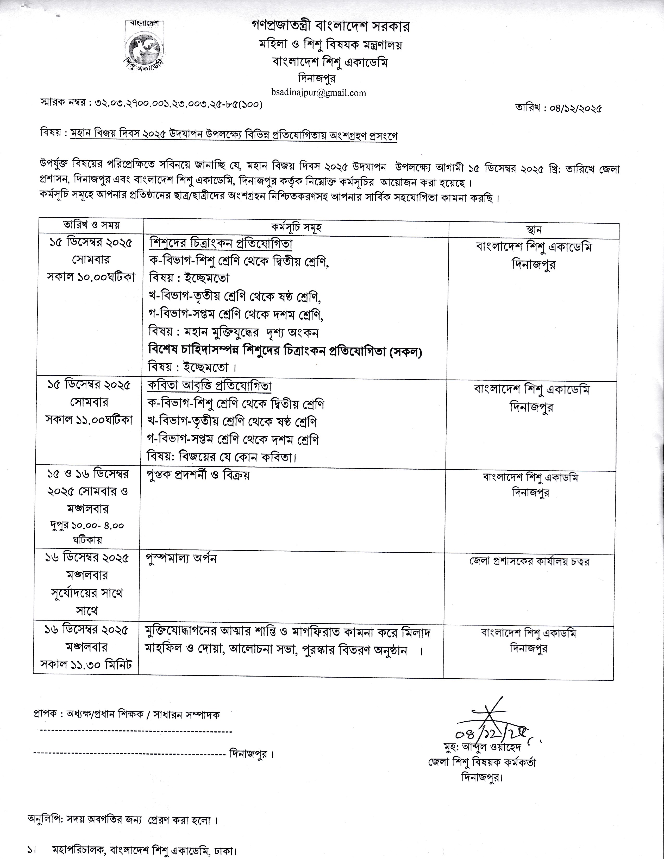 মহান বিজয় দিবস ২০২৫ উদযাপন উপলক্ষ্যে বিভিন্ন প্রতিযোগিতায় অংশগ্রহণ প্রসঙ্গে