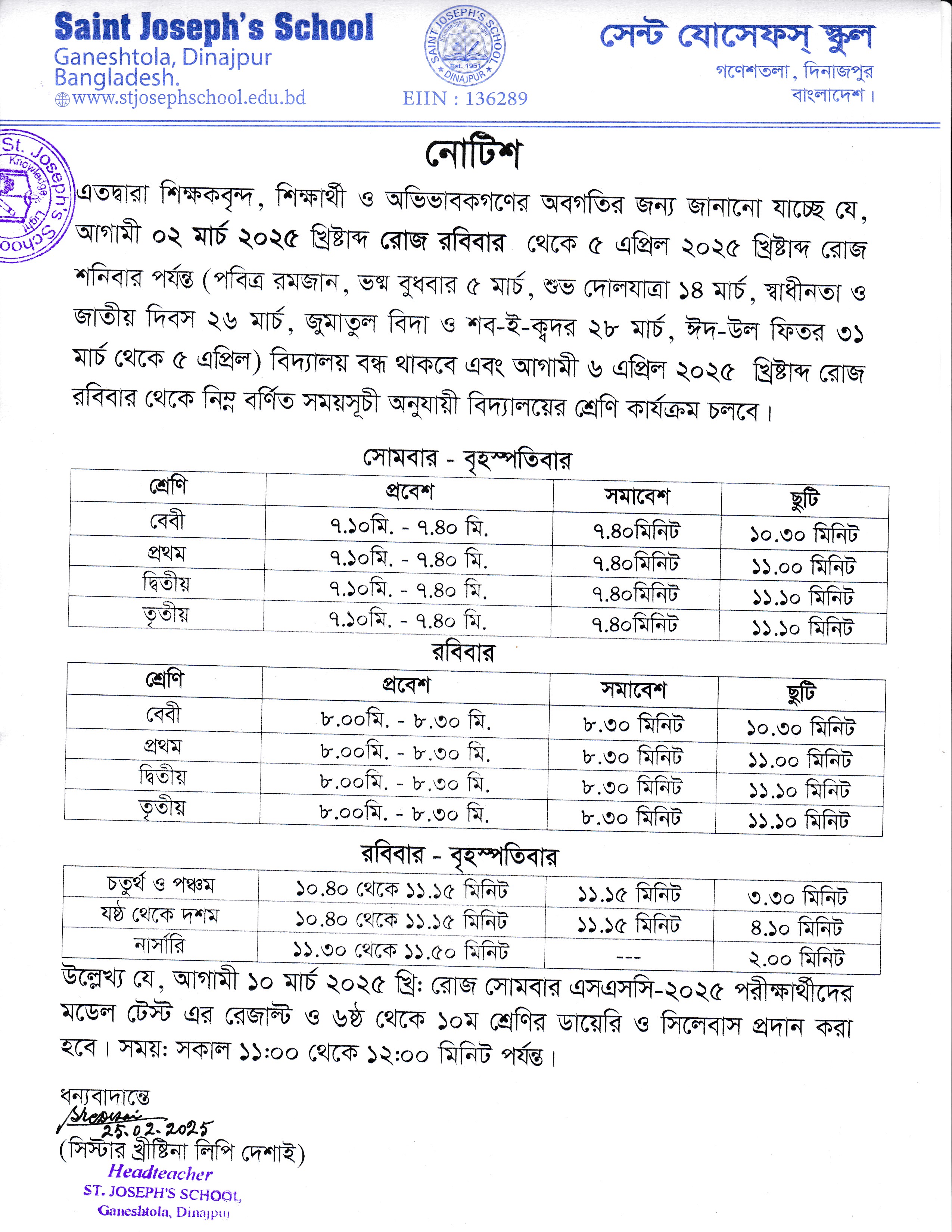 পবিত্র রমজান, ভষ্ম বুধবার, বিদ্যালয়ের সময়সূচী, শুভ দোলযাত্রা, স্বাধীনতা ও জাতীয় দিবস, জুমাতুল বিদা ও শব-ই-ক্বদর, ঈদ-উল ফিতর প্রসঙ্গে ২০২৫ খ্রি: