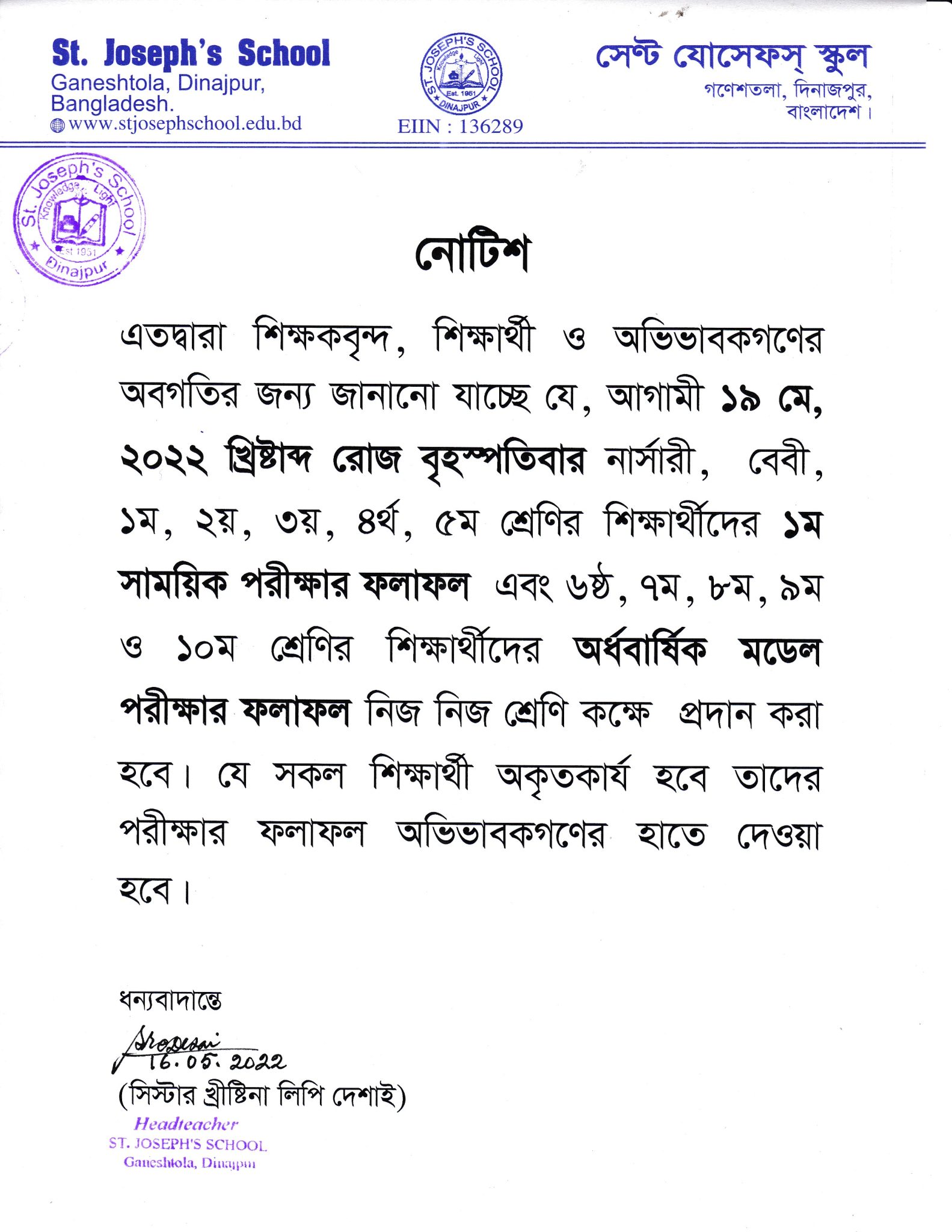 প্রথম সাময়িক ও অর্ধবার্ষিক মডেল পরীক্ষার ফলাফল প্রসঙ্গে ২০২২ খ্রি: