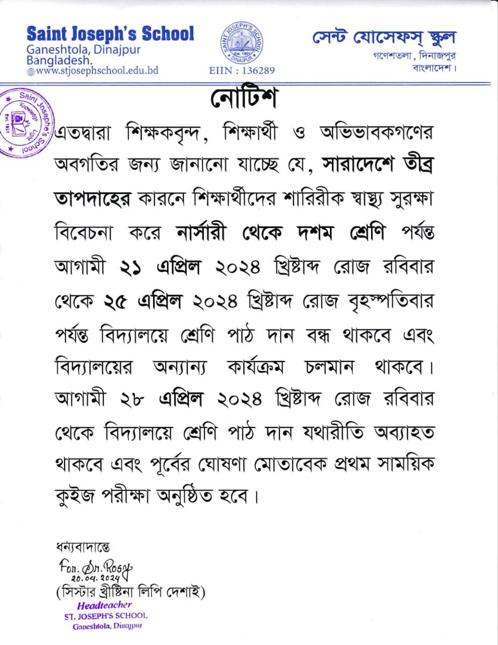 সারাদেশে তীব্র তাপদাহের কারণে ২১শে এপ্রিল হতে ২৫ এপ্রিল পযর্ন্ত বিদ্যালয় বন্ধ থাকবে।