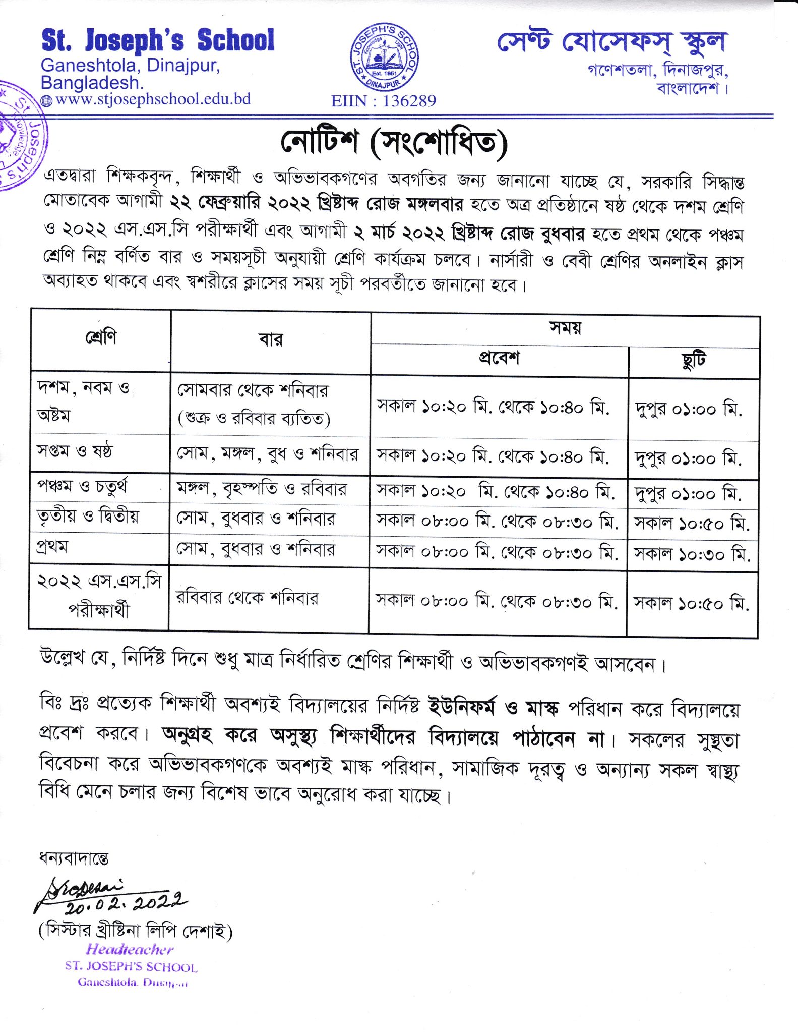 স্বশরীরে পুনরায় ক্লাস শুরু হওয়া প্রসঙ্গে ২০২২ খ্রিঃ (সংশোধিত)